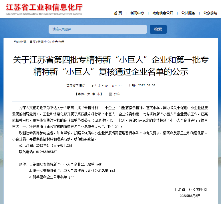 2022年8月8日,江苏省工业和信息化厅发布了《关于江苏省第四批专精特新“小巨人”企业和第一批专精特新“小巨人”复核通过企业名单的公示》,江苏龙冶节能科技荣幸入围第四批国家级专精特新“小巨人”企业名单!