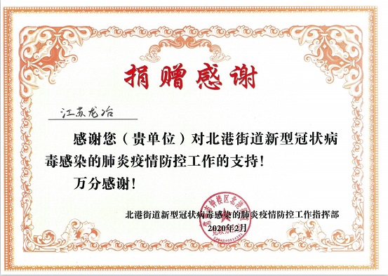 面对来势汹汹的疫情,江苏龙冶快速反应,第一时间成立疫情防控小组,对内进行有效防疫部署,同时积极承担企业社会责任。由江苏龙冶董事长孟晓东亲自组织安排,尽己所能援助抗疫一线,第一时间向常州市钟楼区北港街道新型冠状病毒感染的肺炎疫情防控工作指挥部捐赠5万元防疫专项资金。